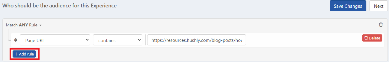 - Select the audience (using Page URL, Page URL Path, Traffic Source), location (using IP Address, Country), and device type. To know more about rules, refer to the topic, More About Rules.