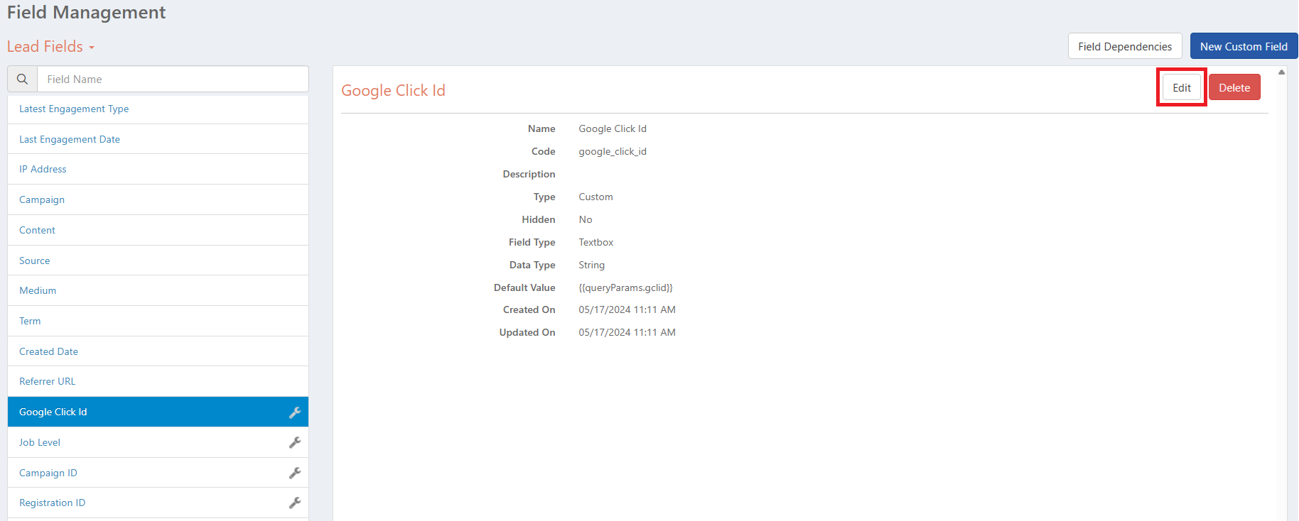 - Select the lead custom field and click Edit.