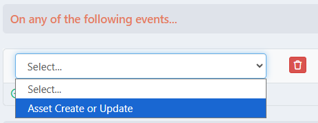 - Select a triggering event for the automation rule. he dropdown menu displays available events, “Asset Create or Update”, which determines when the automation rule should be executed.
