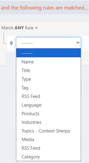 A dropdown menu is provided to select the field or attribute (such as Name, Title, Type, Tag, Language, Category and Custom fields, etc.) that will be evaluated.