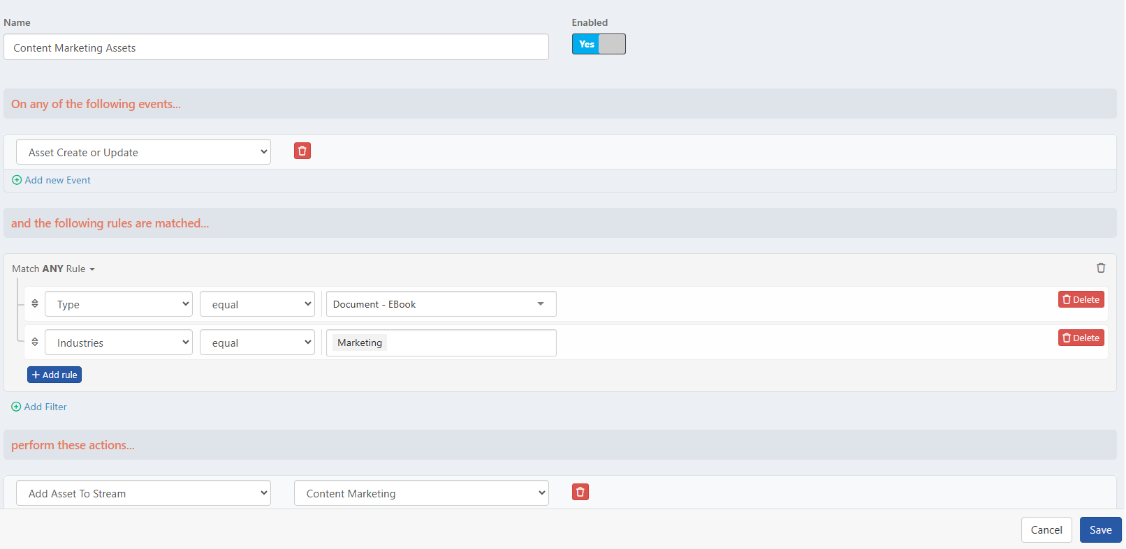 Note: You can add more streams in this section by clicking on the Add new Action link. - After configuring all the required fields in the Automation Rule, click Save to apply the changes.