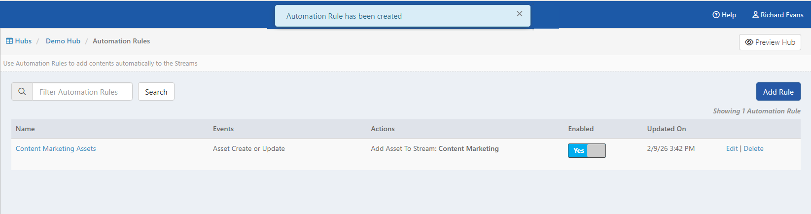 - The automation rule is saved successfully, a confirmation message is shown, and the rule is displayed on the listing page.