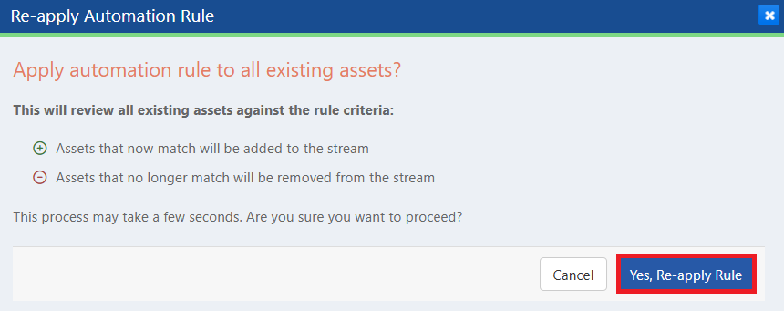 - The Re-Apply Automation Rule confirmation dialog is displayed with Cancel and Yes, Re-apply Rule buttons. Clicking the Yes, Re-apply Rule button adds assets that now match the rule to the stream and removes assets that no longer match the rule from the stream.