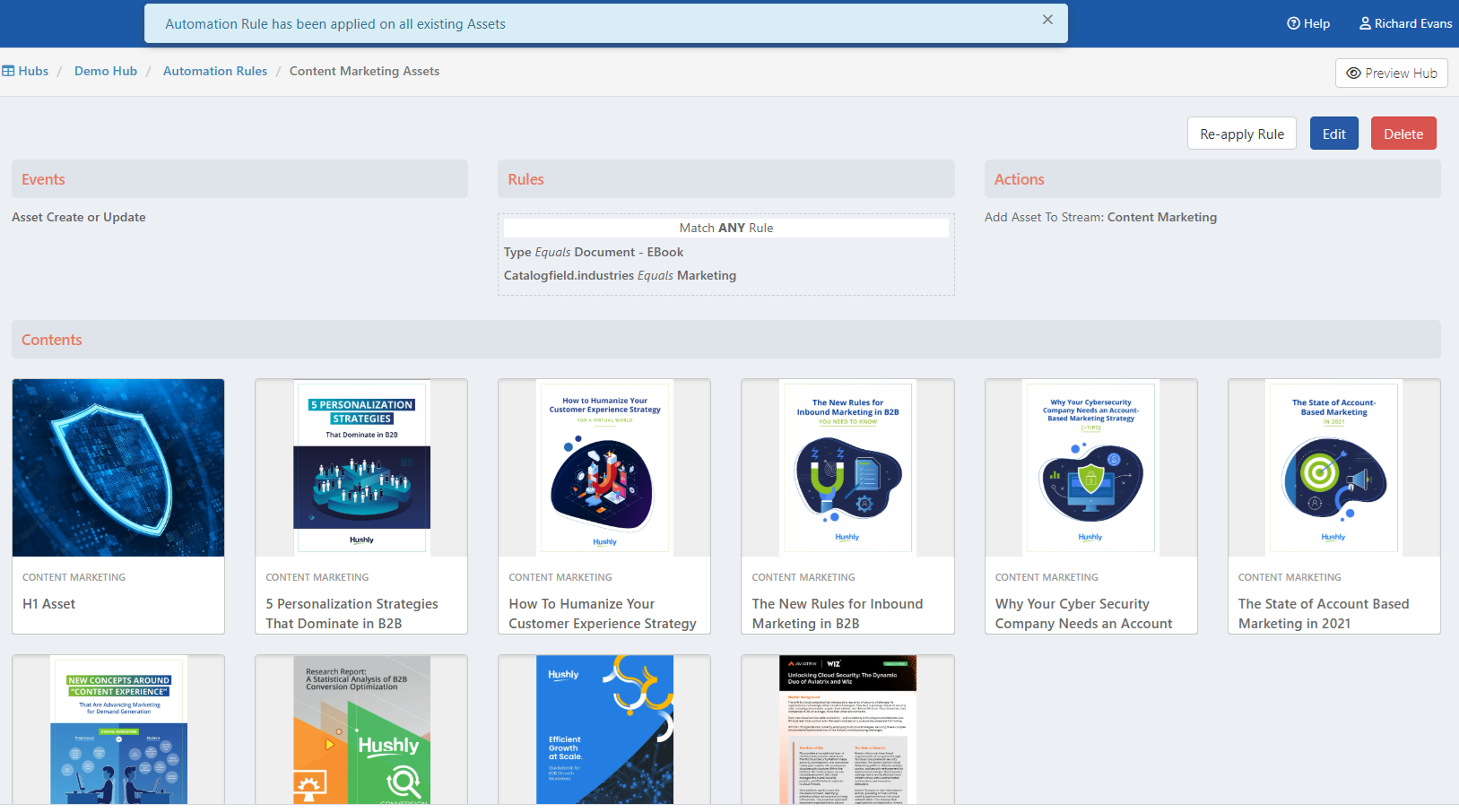 Important: When you create an automation rule, some Assets may already exist in the Assets section of Hushly. The automation rule is not applied retroactively to the existing Assets. Please apply the rule to the existing Assets by clicking on the Re-apply Rule button.