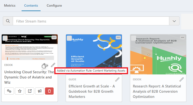 - Hover over the wand icon to see which automation rule added the Asset to the Stream