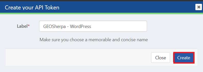 - The Create Your API Token dialog box is displayed. Enter a label name to identify the token, then click Create to generate the API token. .