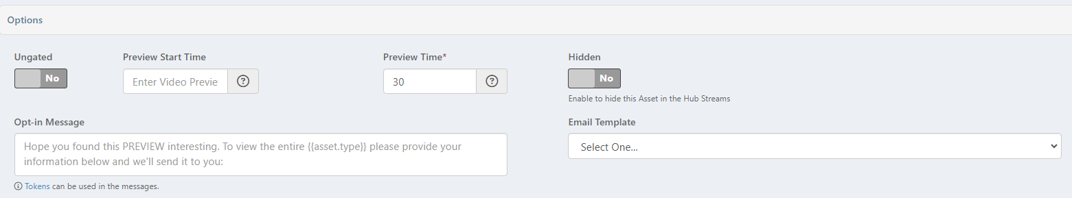 - Options: Ungated, Preview Start Time, Preview Time, Opt-in Message, Hidden, and Email Template.