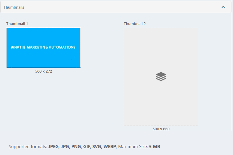 - Thumbnail 1 (500x272 pixels). The supported formats for Thumbnail 1 and Thumbnail 2 are JPEG, JPG, PNG, GIF, SVG, and WEBP.