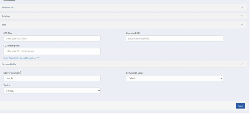 - SEO: SEO Title, SEO Description, and Canonical URL.