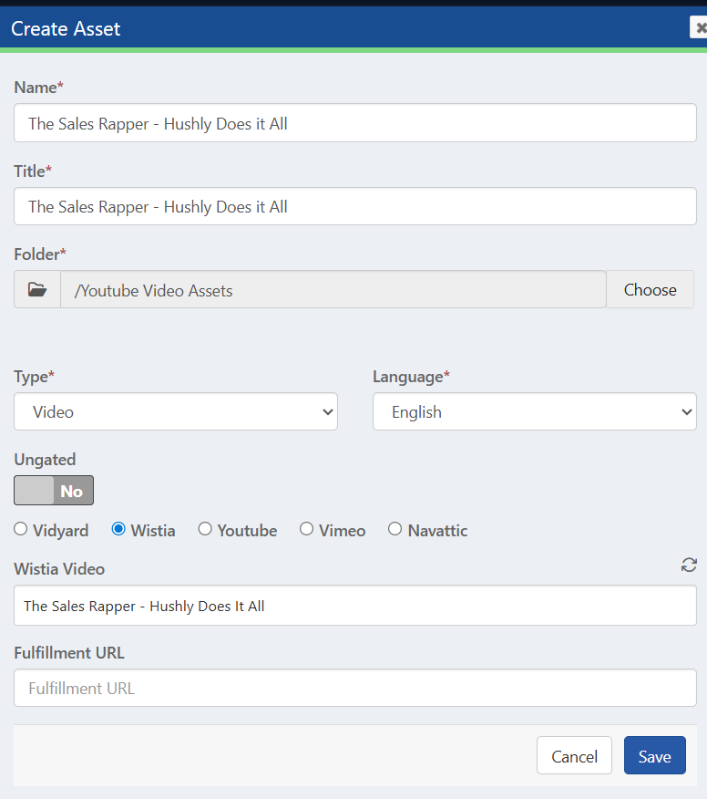 Note: The mandatory information fields of the Setup tab, Name, Title, Type, the Wistia video, and the fulfillment URL are filled with the values you have already configured for the Asset. However, you can make changes to all of them (optional).