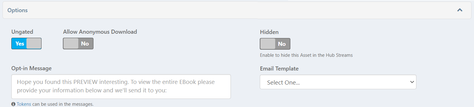 - You can attach a specific Email Template to the Asset. When a user submits the opt-in form with a business email for this Asset, the email template configured here will be sent to the user.