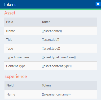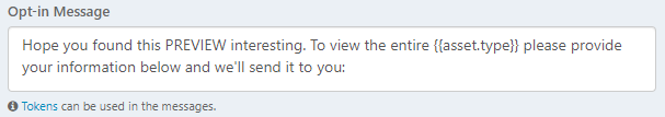Optionally, click Tokens to use them in the opt-in message. Use the {{asset.name}}, {{asset.type}}, and {{asset.content.type}} tokens to refer to the Asset information dynamically.