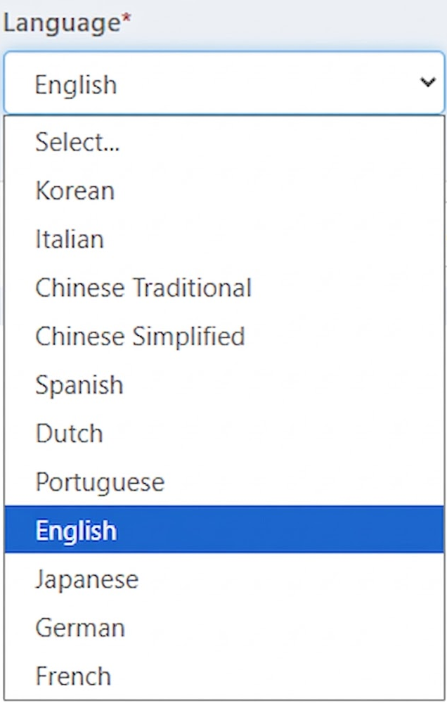 The Type list is defined at Setup > Asset Types. - By default, English is selected. You can select another language from the drop-down list.