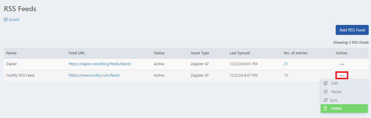 - On the RSS Feeds page, click the three-dot and select Delete.