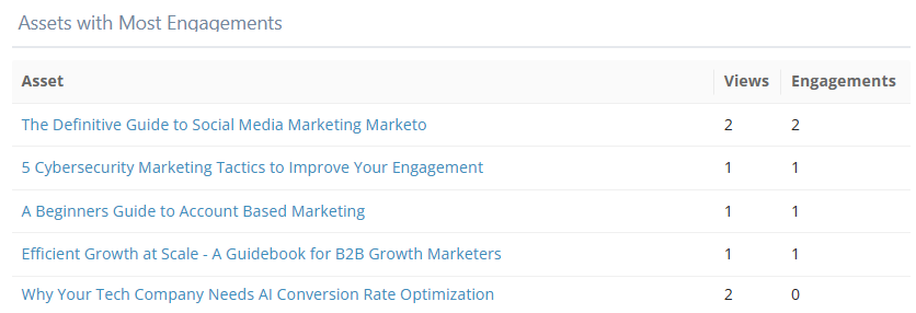 The Assets with Most Engagements section displays a ranked list of contents (assets) based on how often they have been viewed and engaged with by users.