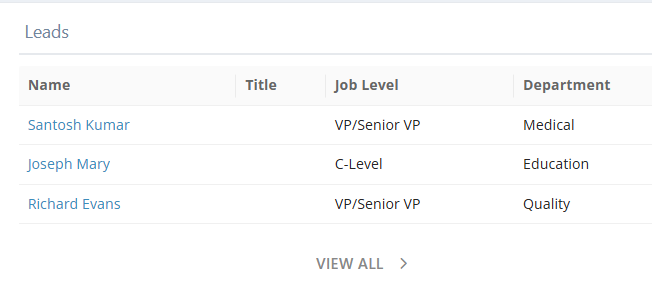 The Leads section highlights the leads generated for the ABM Page. Clicking View All navigates to the Leads listing page.