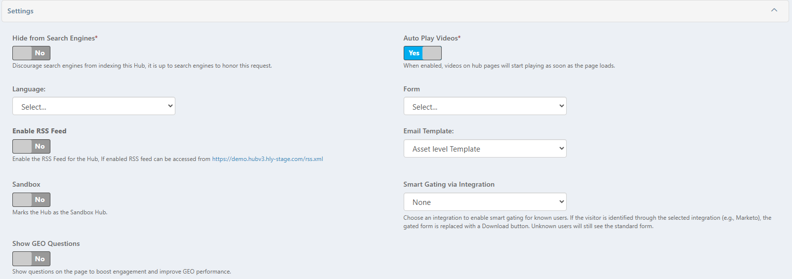 Functionality under Settings:- Hide from Search Engines: By default, the toggle button is set to "No"; search engines can index the hub. Toggling to "Yes" will prevent search engines from indexing the hub (it is up to the search engines to honor this request).