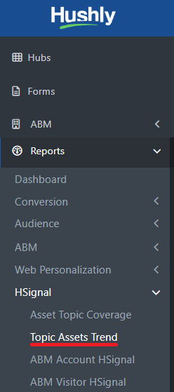 - From the Left Nav Menu, go to Reports > HSignal > Topic Assets Trend.