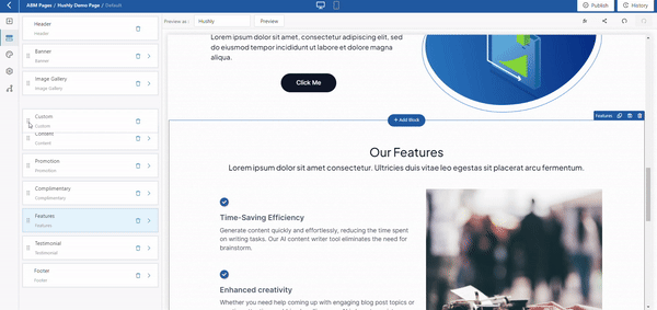 - On an ABM Page, you can add Blocks such as Banner, Promotion, Testimonials, Features, Content, Complementary, Image Gallery, and Custom up to ten times. However, Header and Footer Blocks can only be added once.