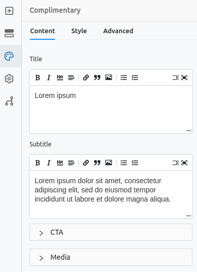 - Click on the Complementary block in the Editor. The Configuration panel opens on the left with the Content tab.
