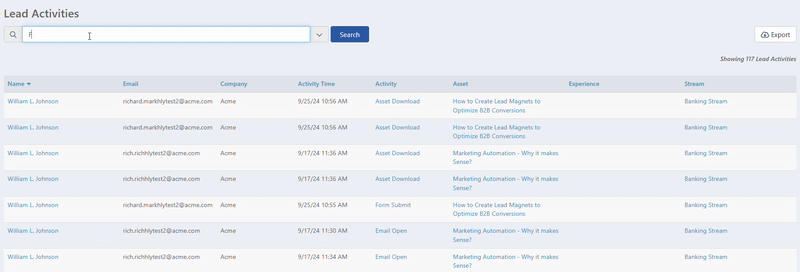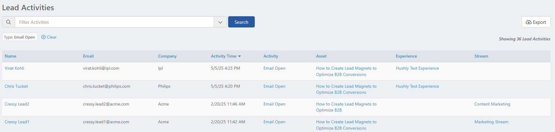 - The Lead Activities page displays the following columns: Name, Email, Company, Activity, Time, Activity, Asset, Experience, and Stream.