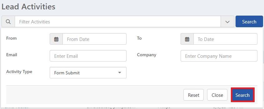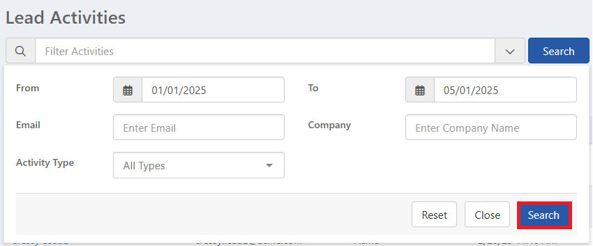 You can search for Activities using filters such as Name, Email, Company, Activity Type, and Asset.