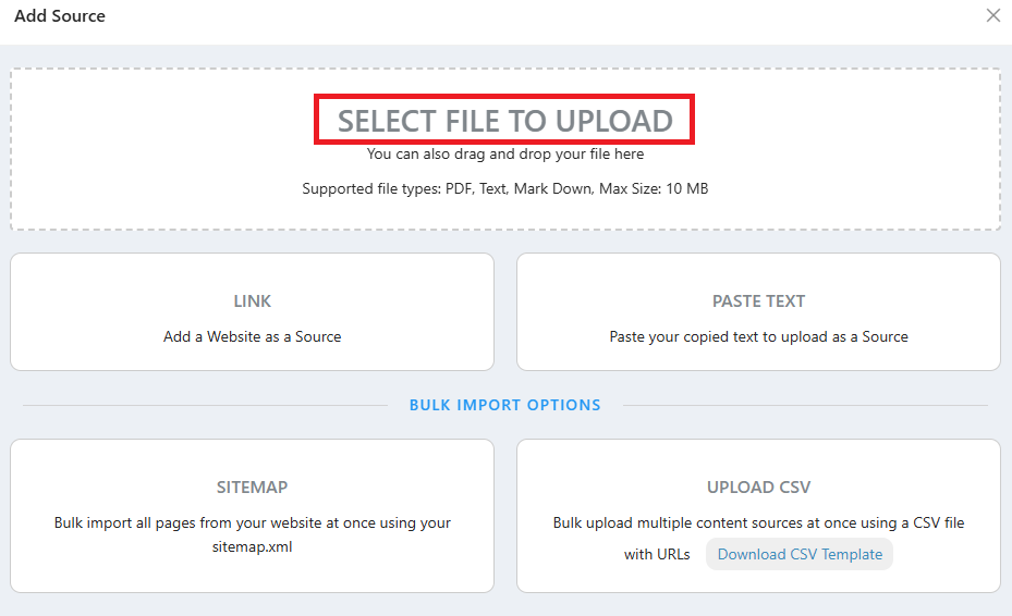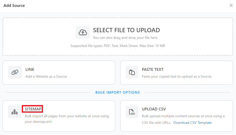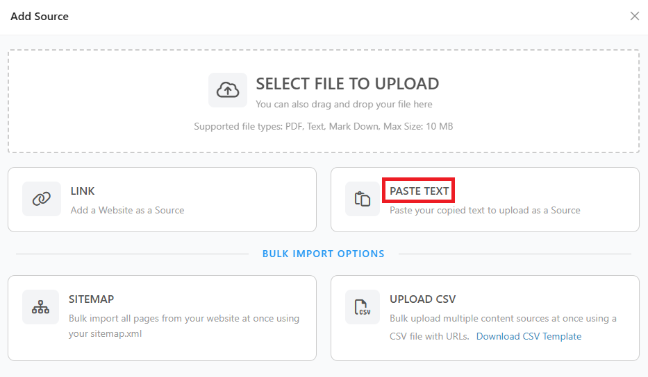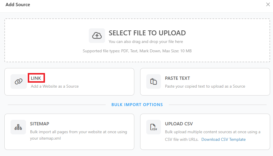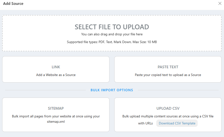 - The Add Source pop-up appears, allowing you to select a source type. You can upload a PDF document, add a link (for example, your company website), or paste text as a source. You can also add sources by uploading a CSV file or by adding sitemaps.