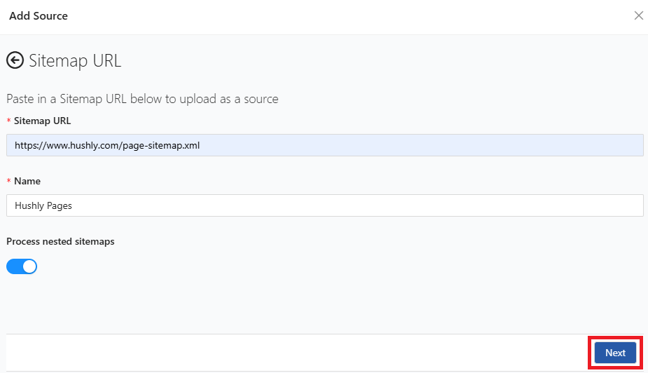 - The Add Source pop-up provides fields to enter the Sitemap URL, assign a Source Name, and enable or disable the Process Nested Sitemaps option, which is disabled by default. When the Process Nested Sitemaps toggle is enabled, any sitemaps referenced in the main sitemap will be imported automatically.
