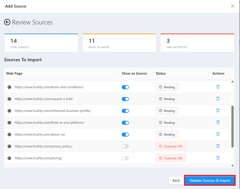Actions: Provides a delete option to remove a specific URL from the list. - Validate Sources & Import - Clicking this button validates all URLs and proceeds with importing the selected sources.