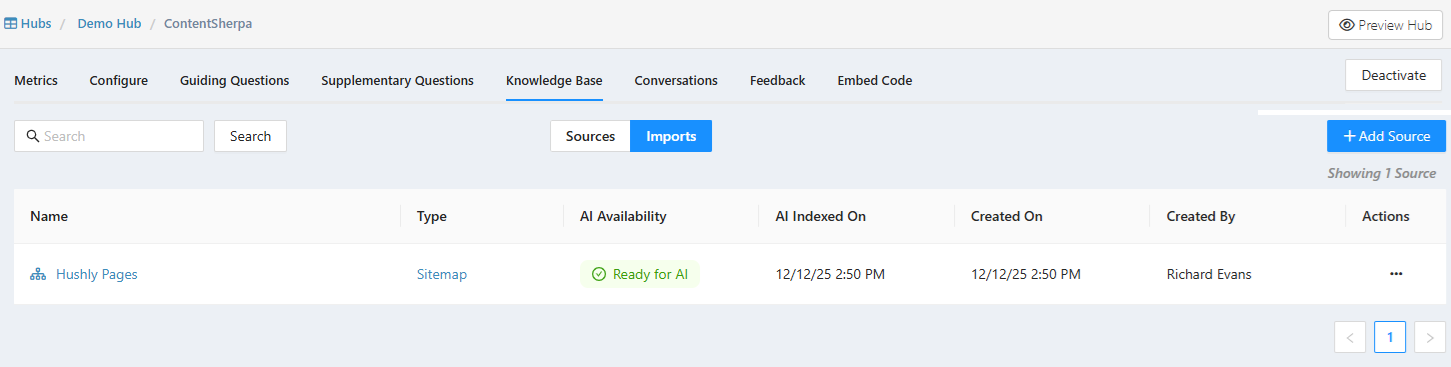 - The Source is added to the ContentSherpa Knowledge Base. The Imports tab displays all the content sources that have been imported into the Knowledge Base for AI processing. Each imported source is listed with key details such as its name, type, AI readiness, indexing time, creation time, and creator information. You can select the Source tab to view all the sitemaps' URLs imported.