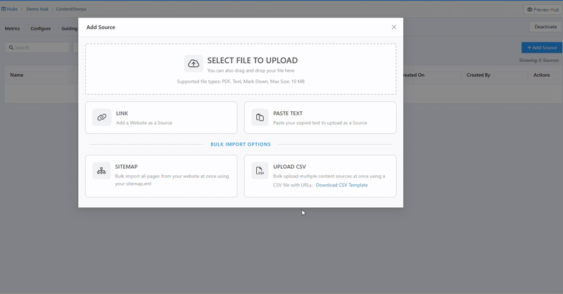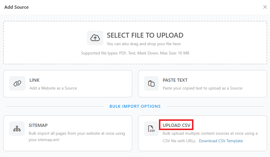 Use this option to bulk upload multiple content sources at once using a CSV file containing URLs.