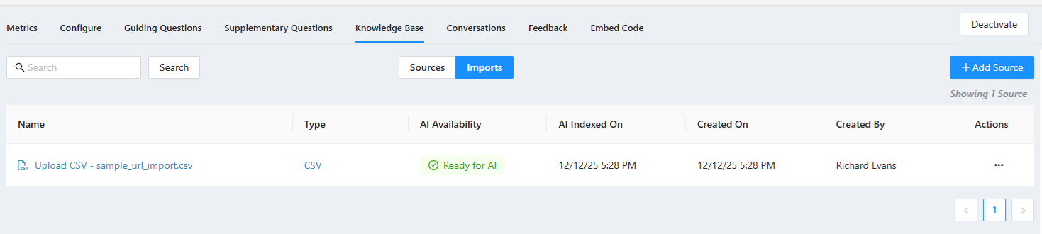 Note: You can delete an imported source by clicking the three-dot menu in the Actions column.
