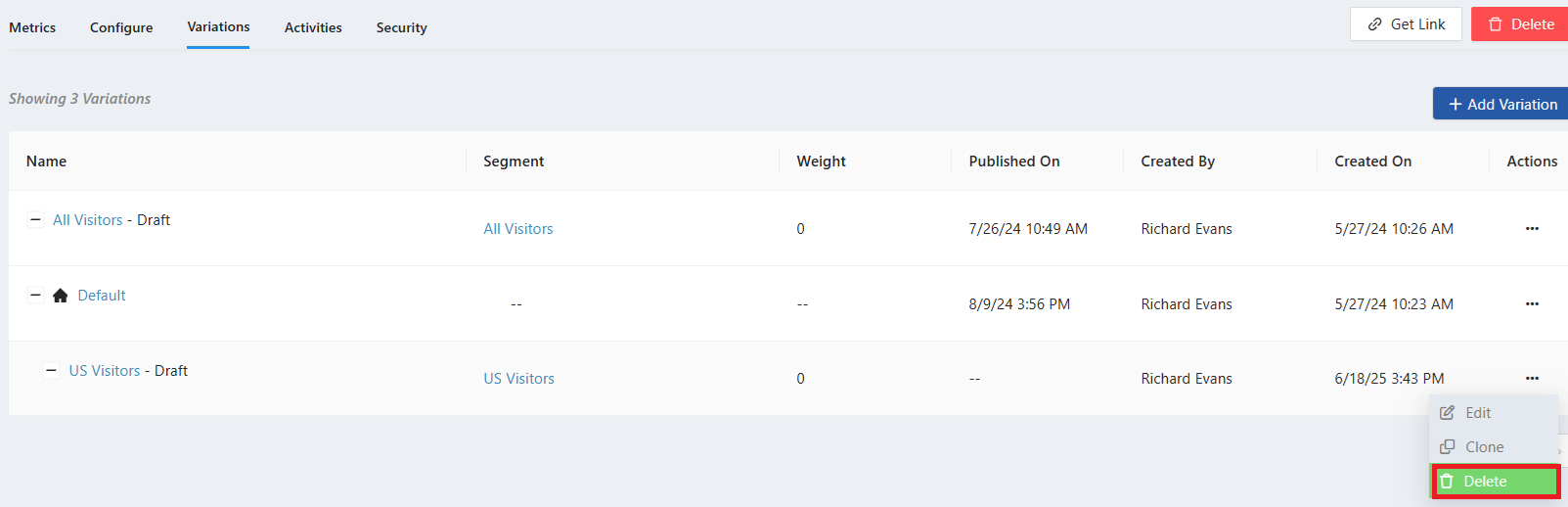 - From the Variations page, select the cloned variation you want to delete, then click Delete from the three-dot menu.