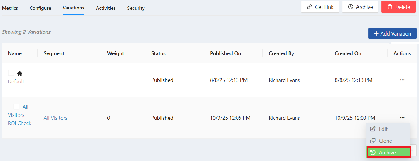 - From the Variations page, select the cloned variation you want to delete, then click Archive from the three-dot menu.