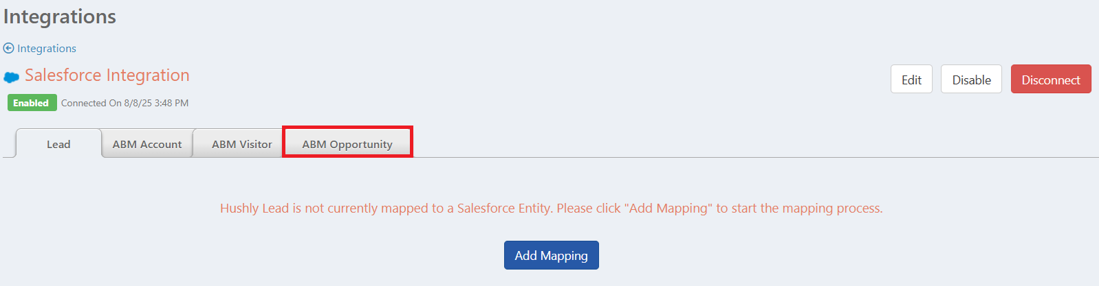 - If your Salesforce account is already integrated with Hushly, navigate directly to the ABM Opportunity tab on the integrations details page. If not, click here to set up the integration.