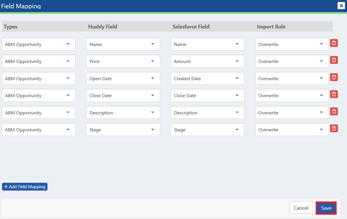 - Map Hushly ABM Opportunity fields to Salesforce Opportunity fields.