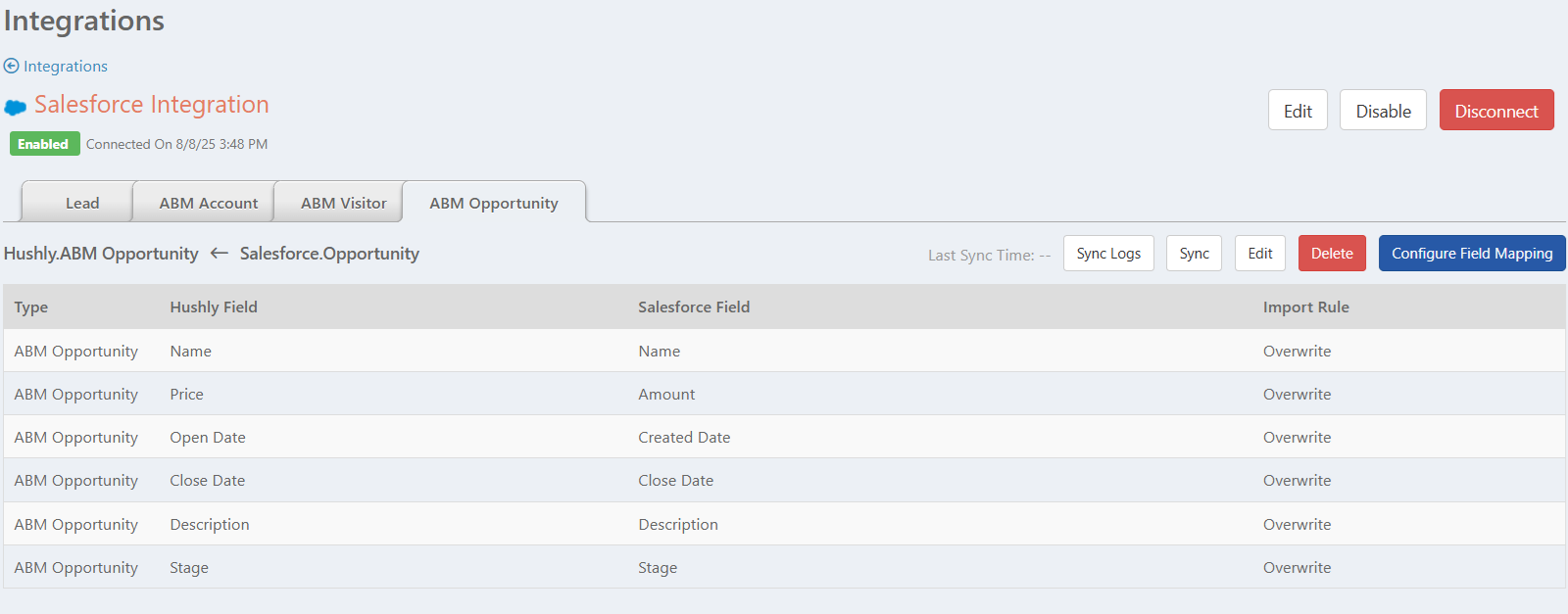 Note: To add additional Hushly fields for mapping with Salesforce fields, click Add Field Mapping. - The ABM Opportunity Mapping page is displayed with Sync Logs, Sync, Edit, Delete, and Configure Field Mapping buttons.