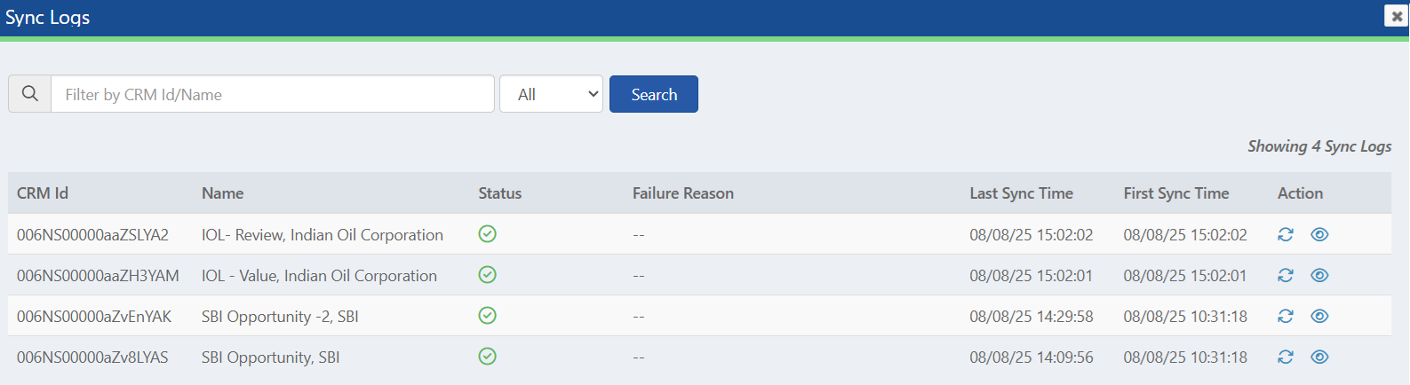 • Sync Logs: Clicking this button opens the Sync Logs pop-up window, displaying a list of all Opportunities that have been synced from Salesforce into Hushly.