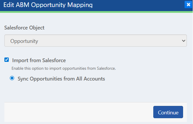 • Edit: Click the Edit button. The Edit ABM Opportunity Mapping pop-up window is displayed. Please make the necessary changes and click Continue. The ABM Opportunity Field Mapping pop-up is displayed. Make changes (optional) and click Save.