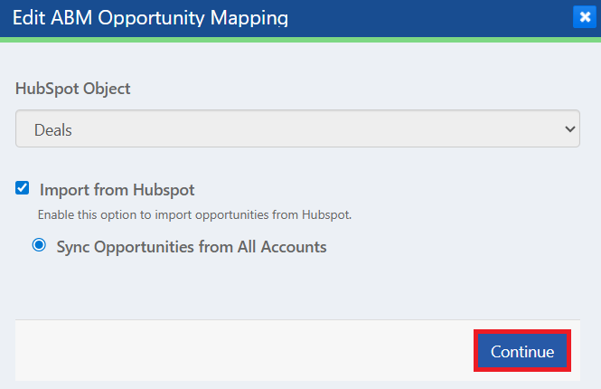 Note: These data syncs are from HubSpot to Hushly and not the other way around. There is an hourly job that runs that will publish to HubSpot and, at the same time, sync from HubSpot. - Edit: Click the button. The Edit ABM Opportunity Mapping pop-up window is displayed. Make necessary changes and click Continue. The ABM Opportunity Field Mapping pop-up is displayed. Make changes (optional) and click Save.