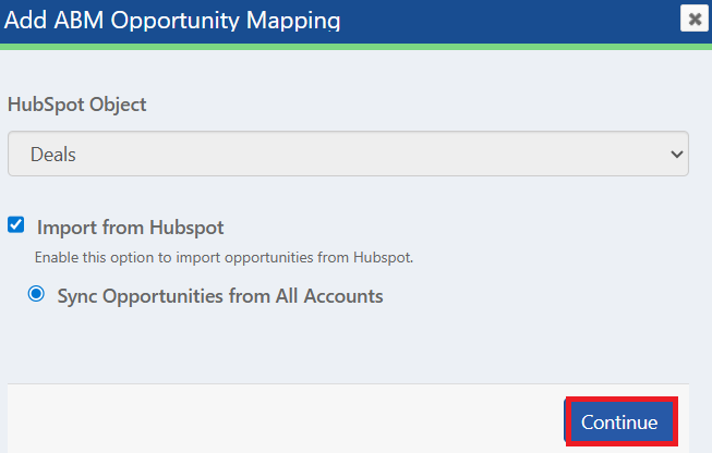 - Enabling the Import from HubSpot, the Sync Opportunities from All Accounts option is auto-selected.