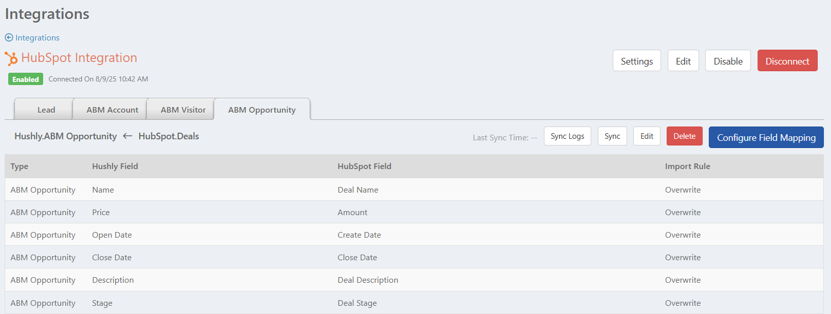 Note: To add additional Hushly fields for mapping with HubSpot fields, click Add Field Mapping. - The ABM Opportunity Mapping page is displayed with Sync Logs, Sync, Edit, Delete, and Configure Field Mapping buttons.