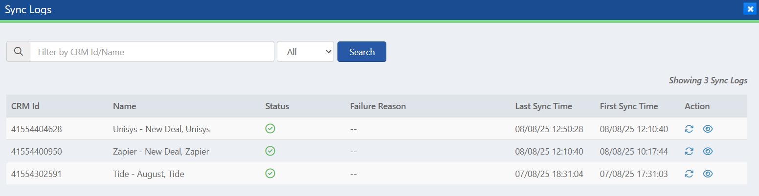 - Sync Logs: Clicking the button opens the Sync Logs pop-up window with the following columns: