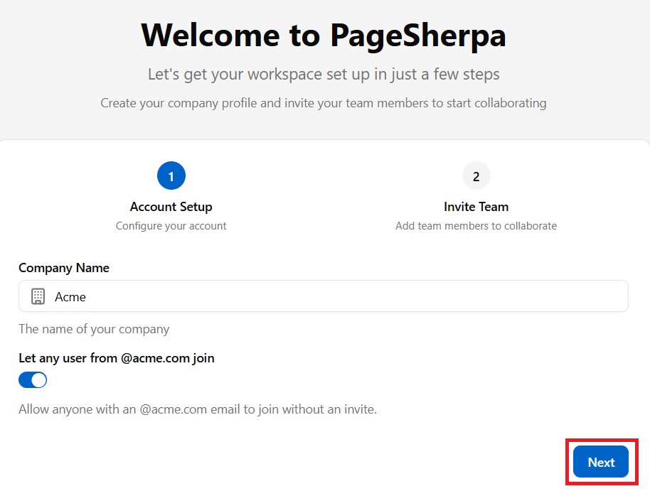 - The Onboarding page is displayed, guiding you to configure your company profile and invite your team. The Company Name is pre-filled by default. Enter your company’s Website URL and click Next to continue.