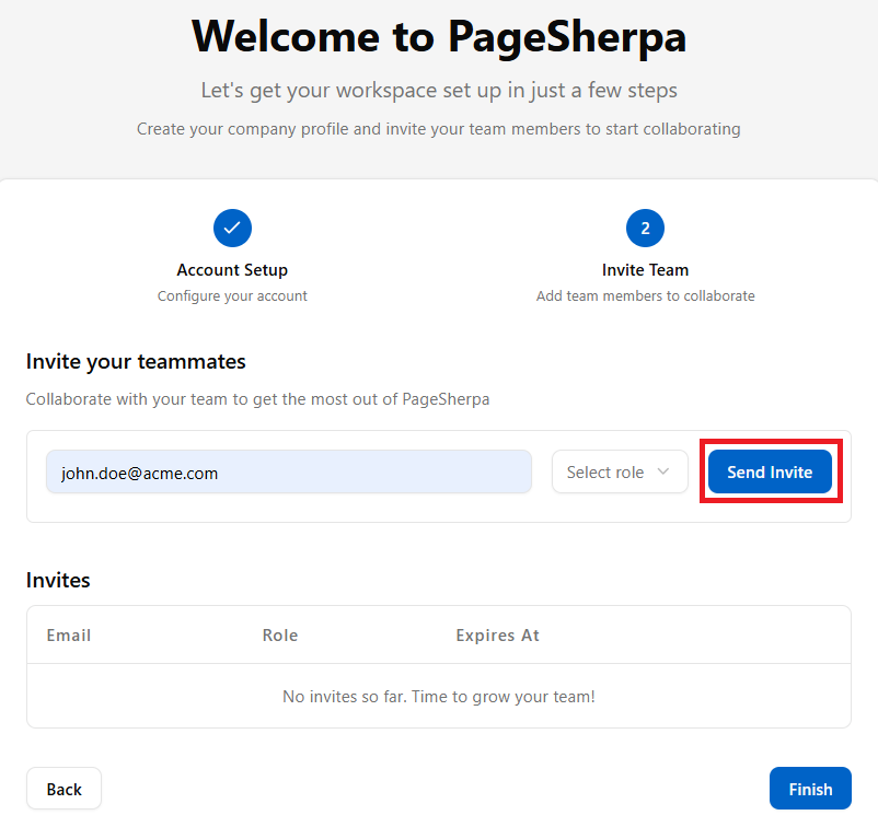 - The Invite Users section is displayed. Enter the user’s email address, select a role (Admin or Editor) from the drop-down list, and click Send Invite.