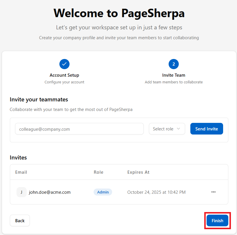 - Clicking the Finish button redirects the user to the PageSherpa Dashboard page.