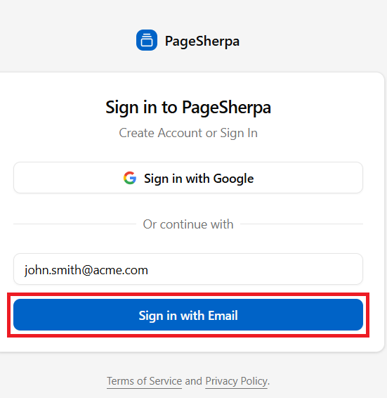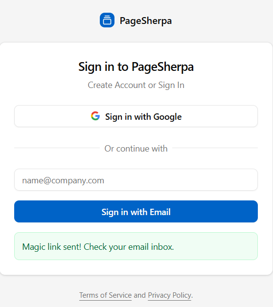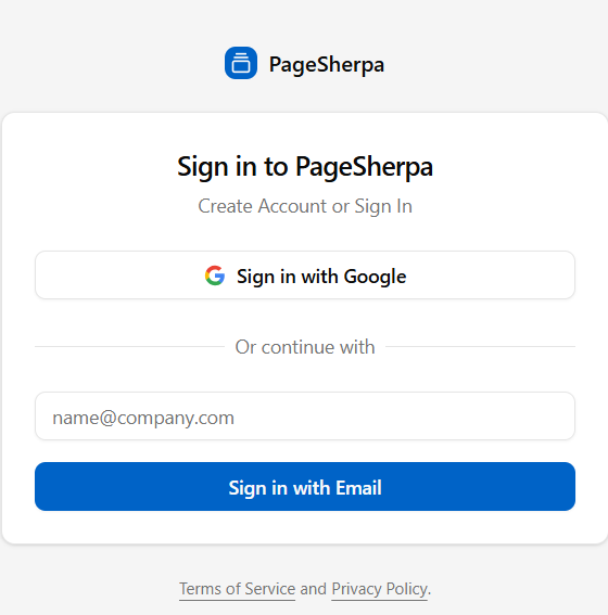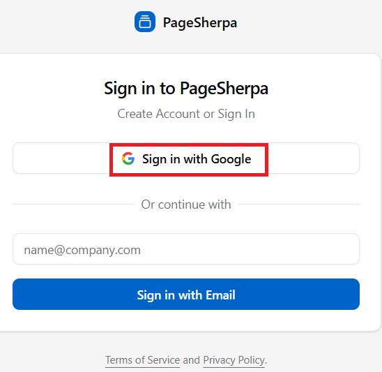 - The Sign in to PageSherpa page appears, allowing you to sign in using either Google or your Email.