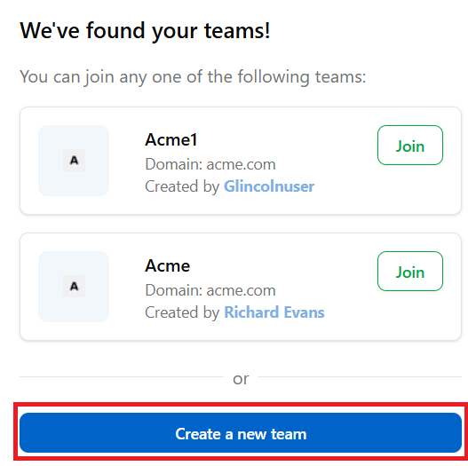 - The Teams page is displayed if another user with the same domain has already signed up. You can choose to join the existing team or click the Create New Team button to set up a new one.