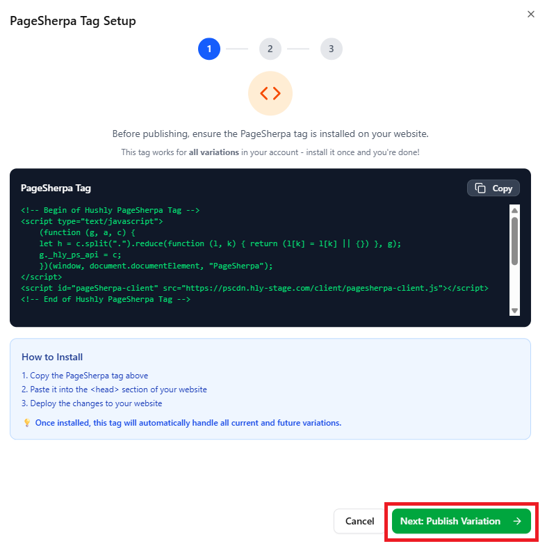 - The PageSherpa Tag Setup pop-up window appears, showing the Tag that needs to be inserted on your website, along with two options: Cancel and Next: Publish Variation buttons. Click Publish Variation.