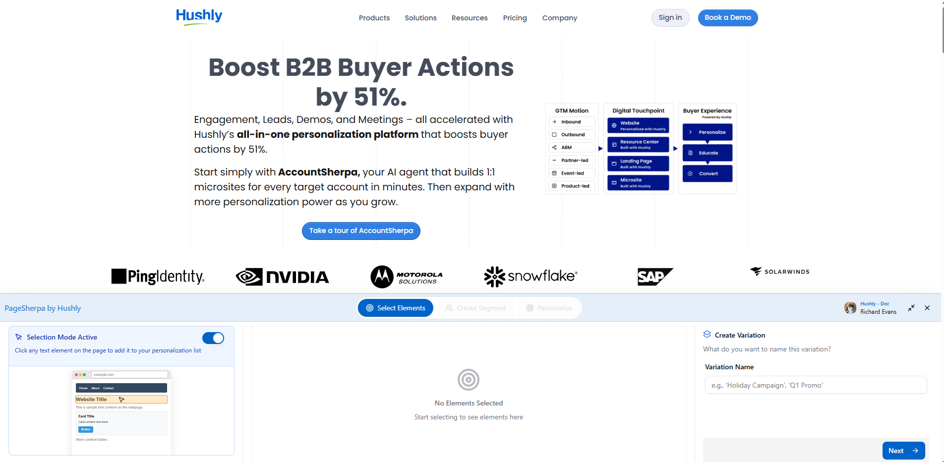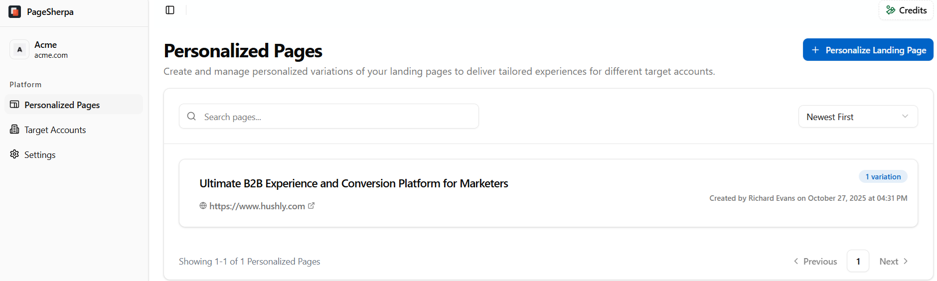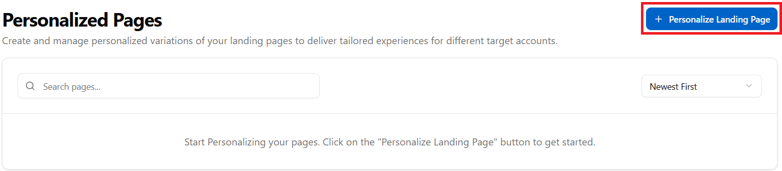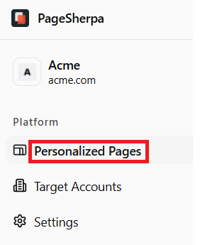 To personalize pages within the application, navigate to the Personalize Pages tab and click Personalize Landing Page. From here, you can begin customizing your webpage content and layout, updating elements, tailoring messaging for target accounts, and applying personalized variations, all directly within the PageSherpa interface.